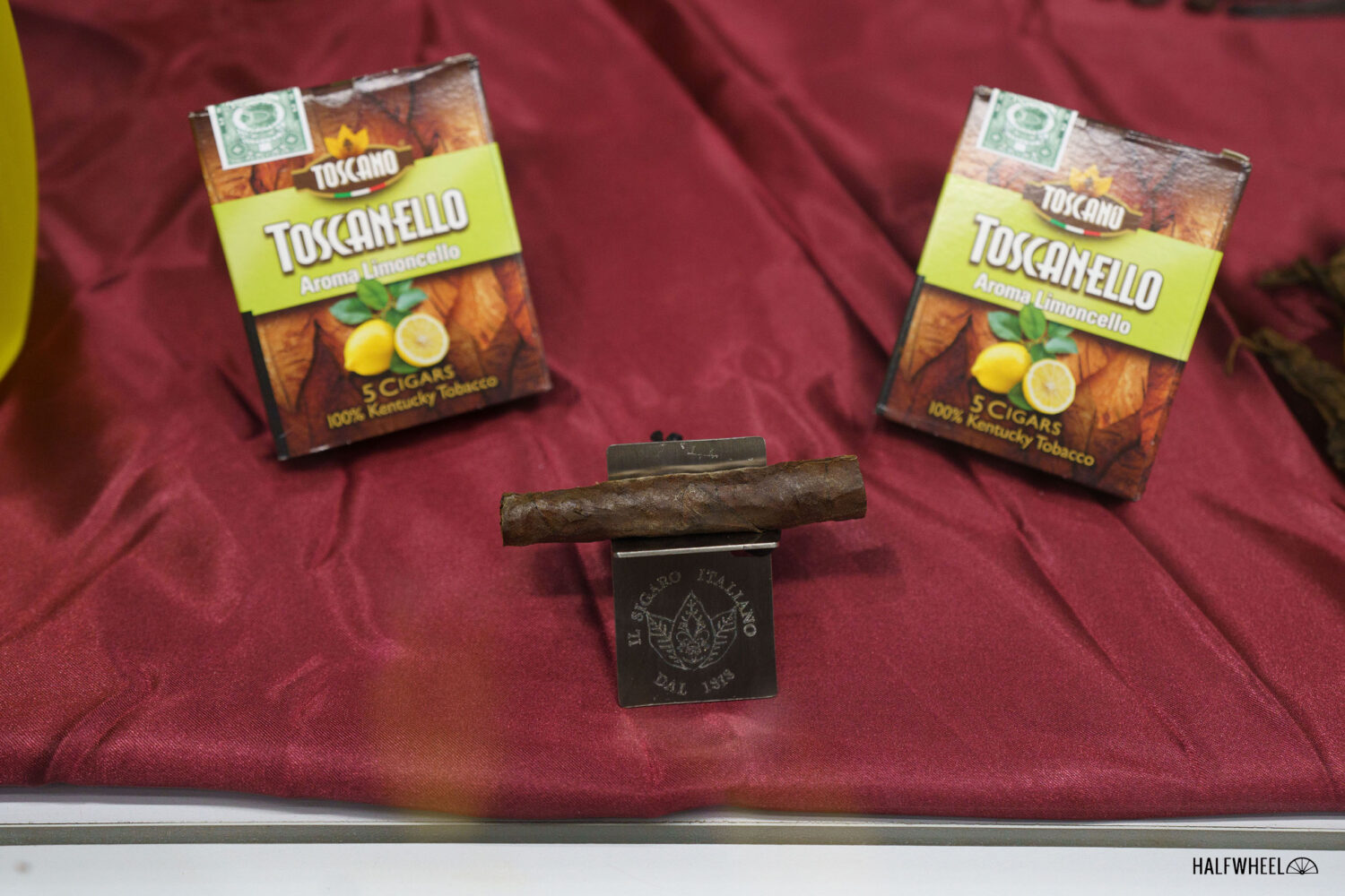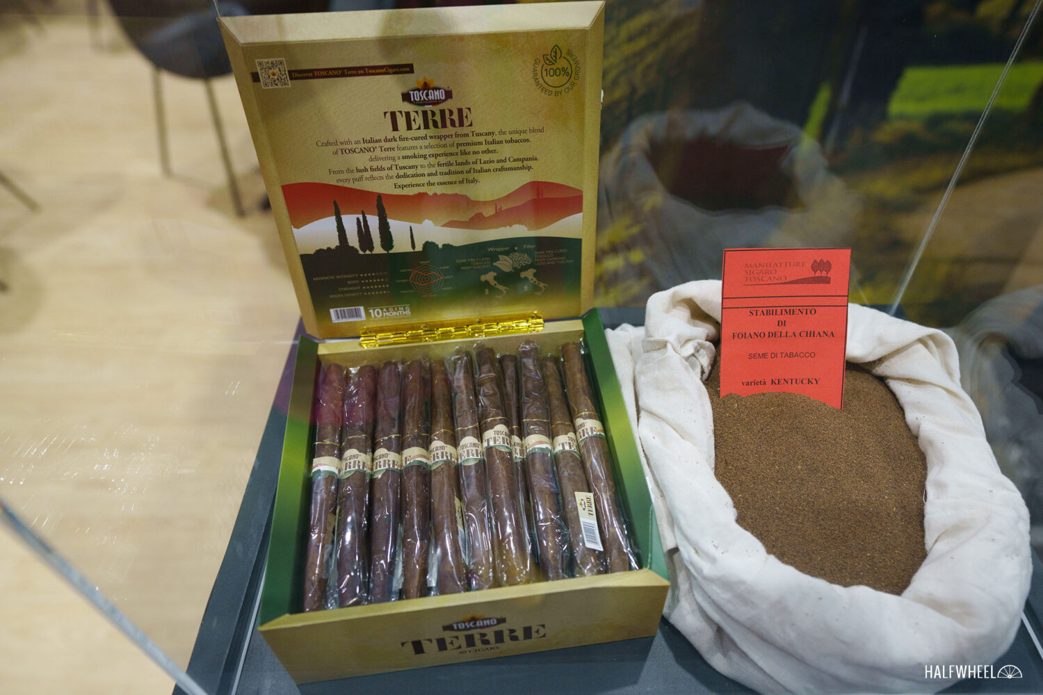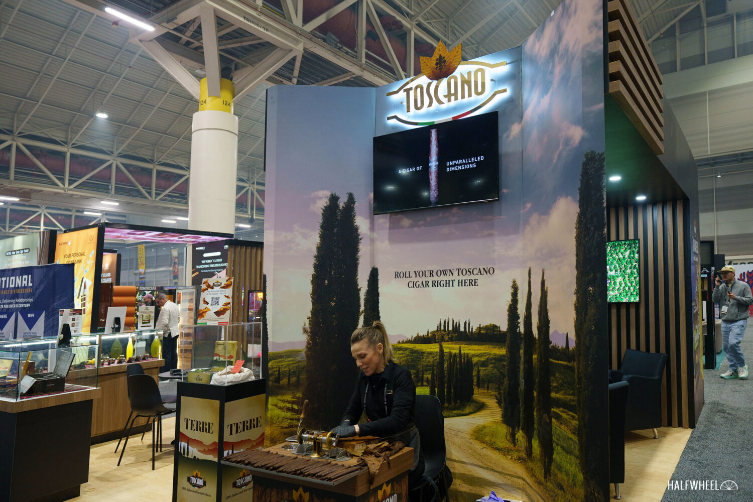Gian hàng của Toscano vẫn giữ nguyên như vậy trong nhiều năm: hình vuông, trong đó một nửa diện tích được chiếm bởi một cấu trúc hình chữ nhật, một trong số ít gian hàng có trần nhà. Phần mái này đóng vai trò như khu vực tiếp khách, nhưng điểm nhấn chính là khu vực cuốn xì gà phía trước. Valentina Pieraccini, một trong những người cuốn xì gà giàu kinh nghiệm nhất của công ty, đã bay từ Ý đến để trình diễn kỹ thuật cuốn xì gà. Mặc dù Toscano thường xuyên mang theo người cuốn xì gà, nhưng mỗi năm lại là một người khác nhau.