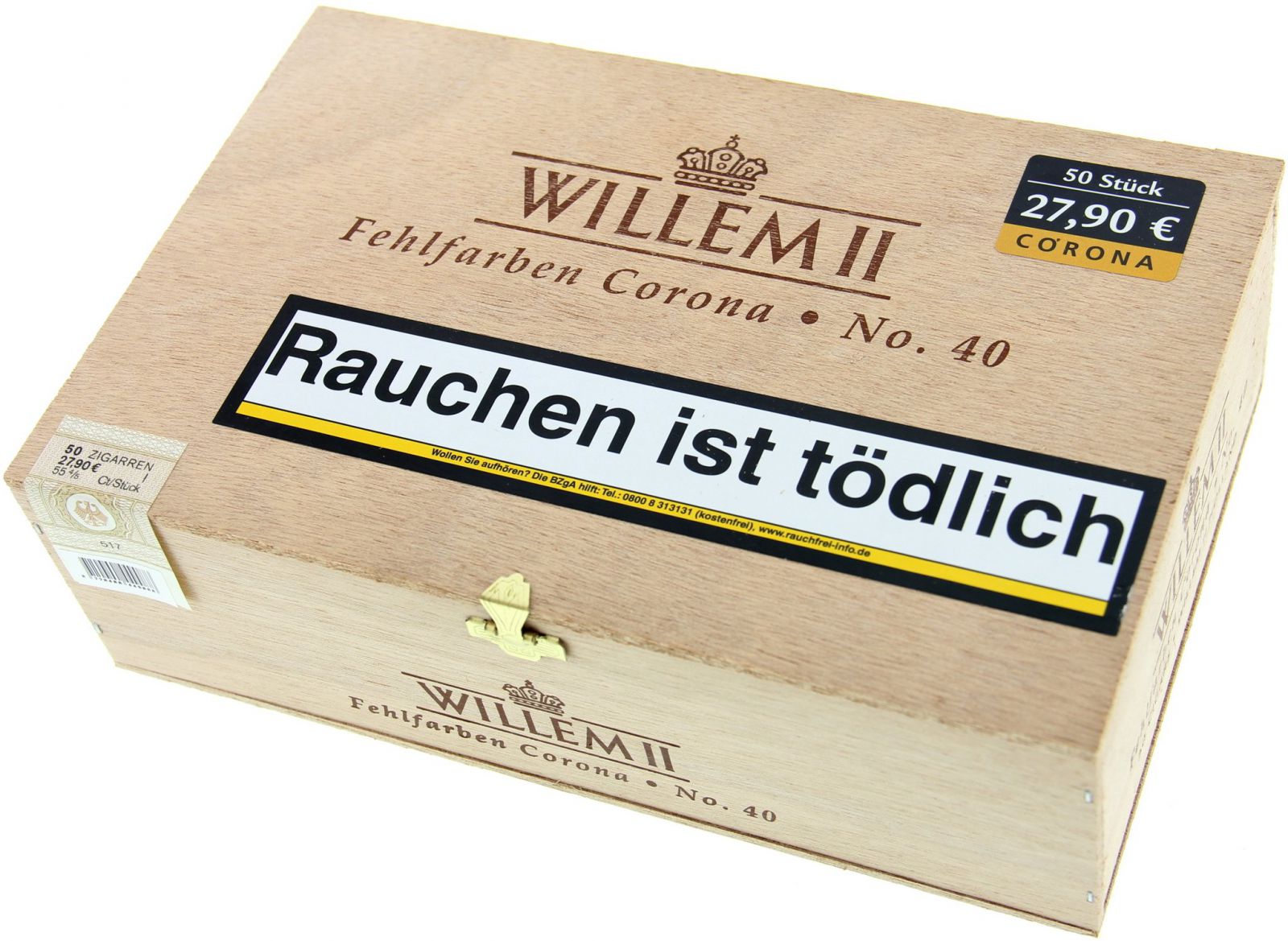 Xì gà này bao gồm một sự pha trộn cân bằng hài hòa giữa các loại thuốc lá chất lượng cao từ Ý, Java, Philippines và Paraguay, được tô điểm với thuốc lá Geudertheimer. Xì gà với chiều dài trung bình Willem II Corona cung cấp hàm lượng nicotine vừa phải. Willem II Corona no 40 thuyết phục khách hàng với hương vị thuốc lá cân bằng. Mùi thơm cay đến lợi thế tốt nhất của nó khi hút